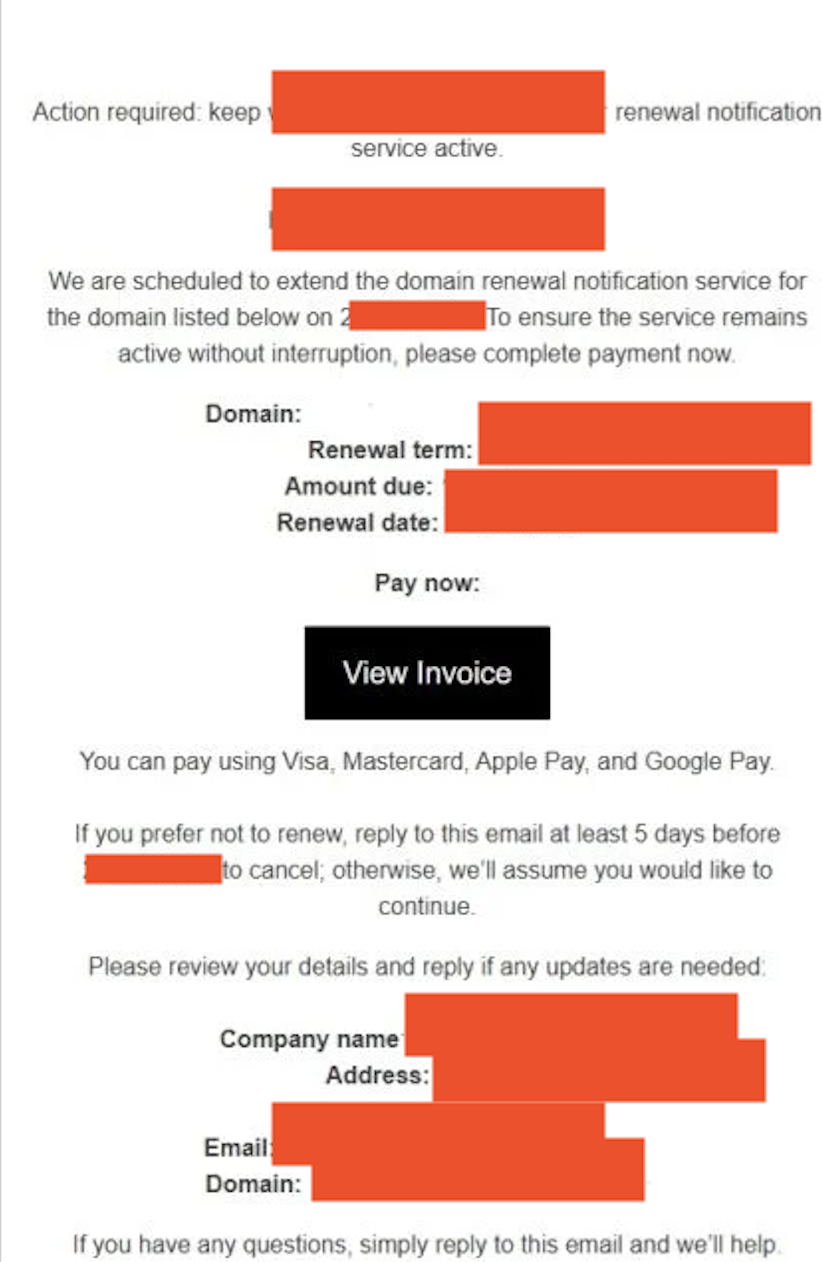 The emails or calls will encourage you to pay for a domain renewal or to safeguard your domain name. The communications look legitimate as it uses publicly available information, like domain name expiry and Registrant Contact Information. If your domain is registered through us, please ensure you log in to your MelbourneIT Customer Area and check the expiry date and auto-renew status and keep your registrant contact information up to date.