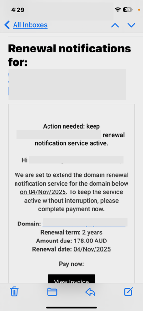 The invoice shows [Domain] - 2 years - Domain renewal notifi cations